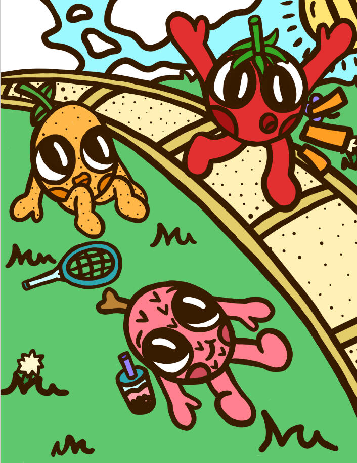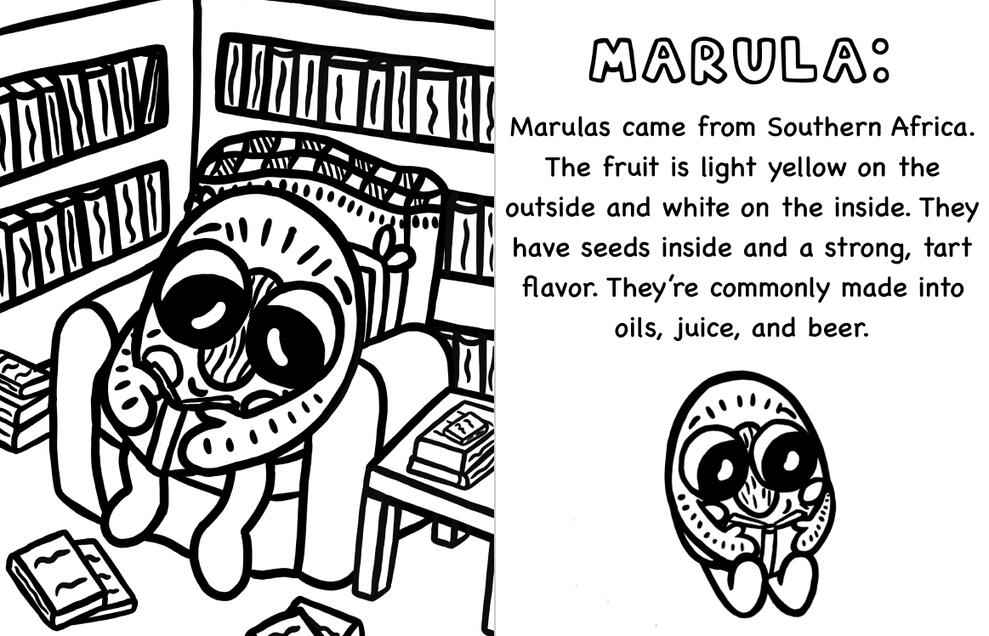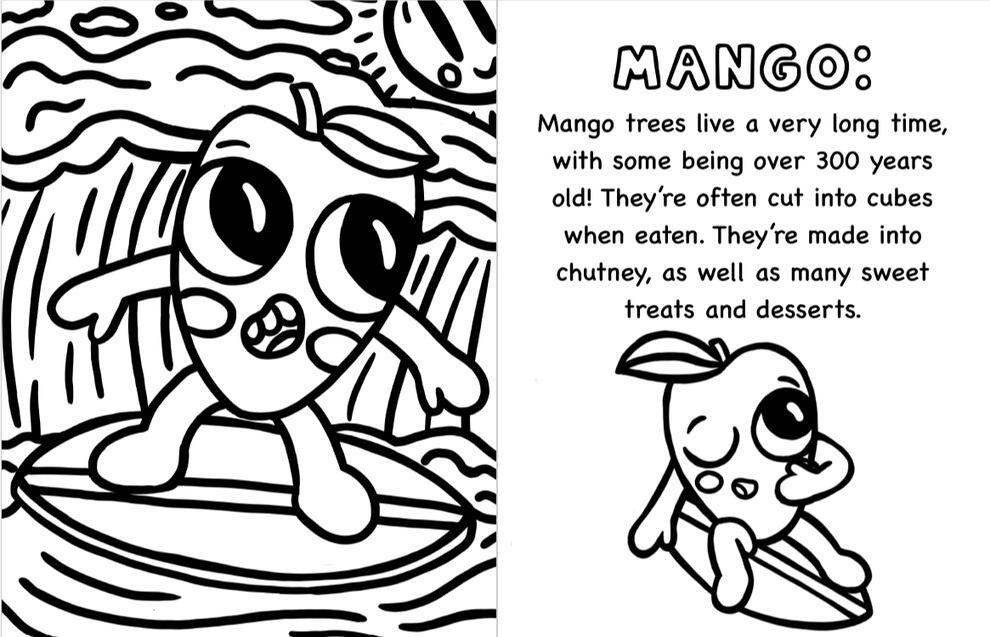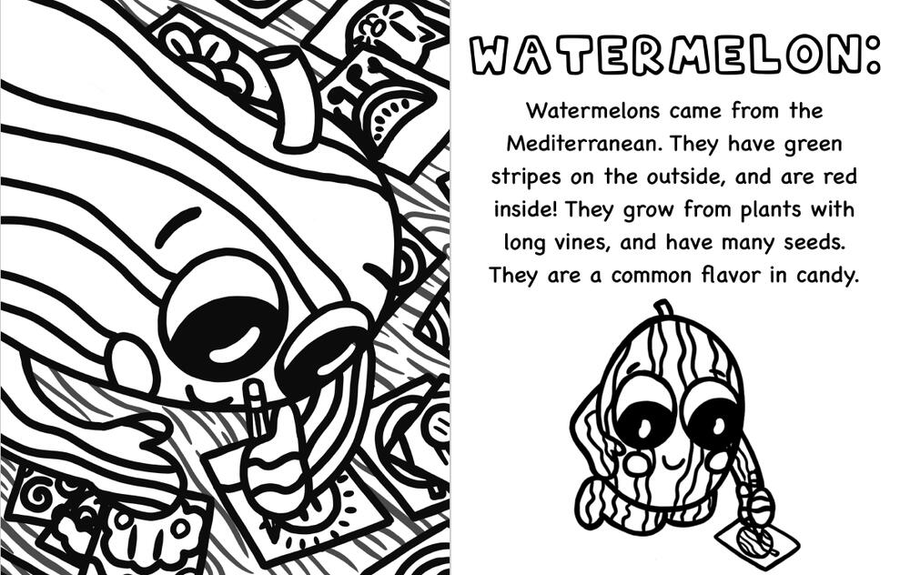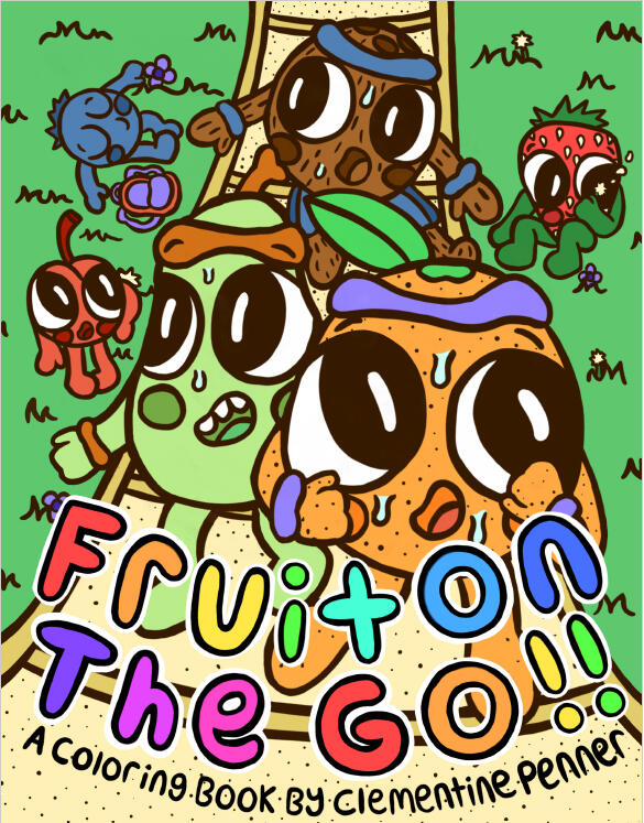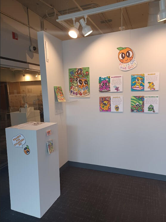 Fruit On The Go! is my senior thesis project at MIAD. It is an educational coloring book, themed around cartoon fruit doing day to day activities. Each page has a fact sheet made to teach young children about where the fruit came from and what dishes it is commonly prepared in.Below I'll attach the front and back cover of the book, some notable pages inside, and pictures of the installation at MIAD's thesis show.